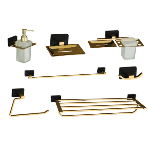 7 COMBO SET- GOLD BLACK SERIES - SOAP DISH + SOAP DISH WITH TUMBLER + LIQUID SOAP DISPENSER + TOWEL ROD + TOWEL RACK + NAPKIN RING + ROBE HOOK
